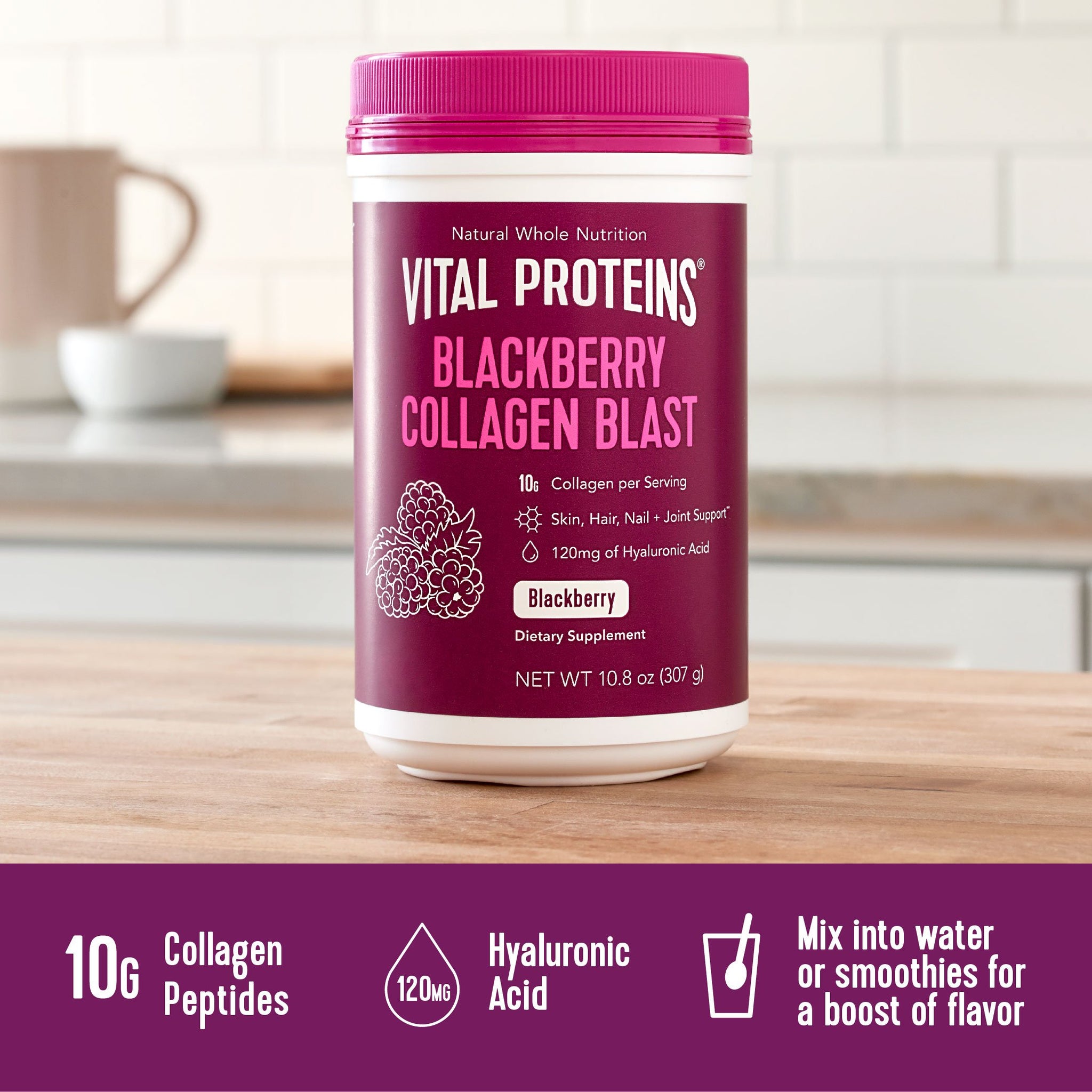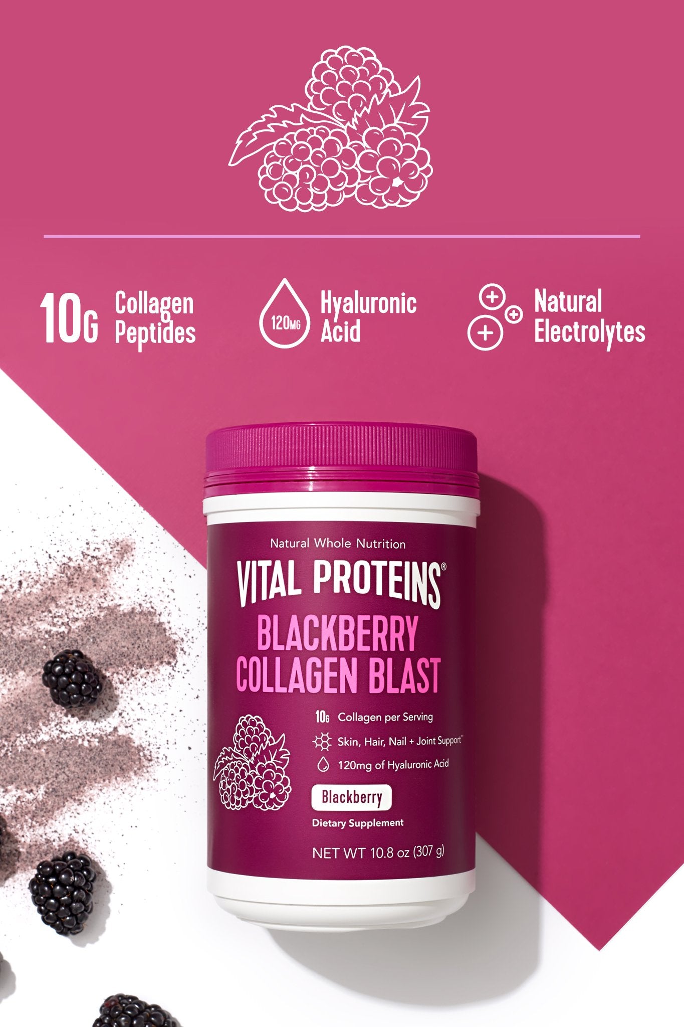 Put your best  fruit  forward when it comes to your wellness routine. Combining collagen peptides and hyaluronic acid to help support skin, hair, nails and joints**, our new Blackberry Collagen Blast* is your  berry  tasty superpower.