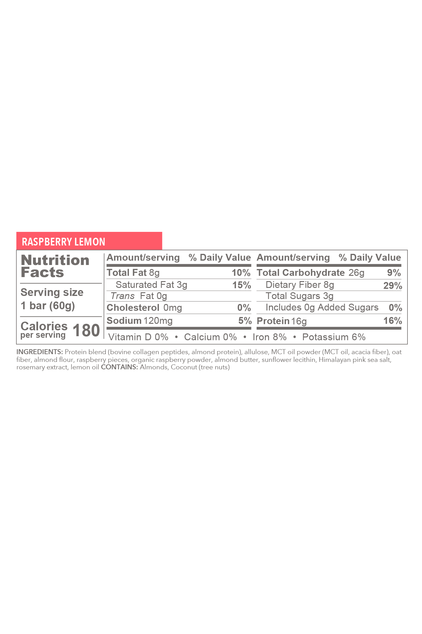 Reach for the complementary combination of raspberry and lemon. With 16g of protein and 3g of sugar, enjoy a zesty, nutrient-rich snack anytime, anywhere. And made with 12g of collagen per bar? Now that’s worth biting for.