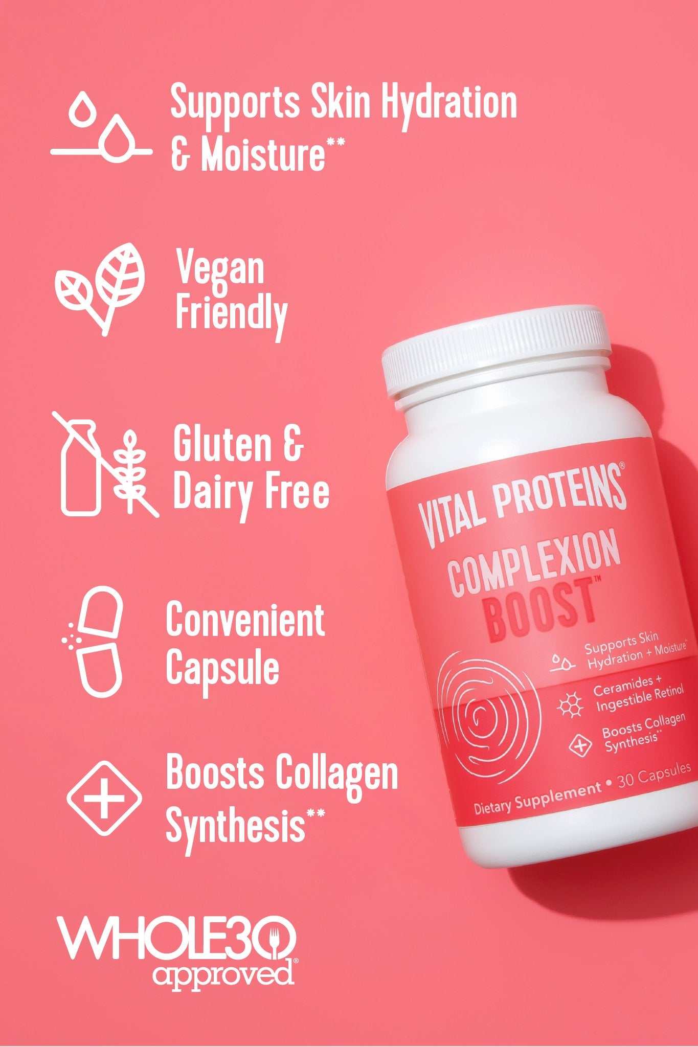 Put your best face forward with our plant-based Complexion Boost™, which contains key ingredients including vitamins for skin health, aka vitamins A, C & E, to help support skin elasticity and improve rough and uneven skin tone — all in one capsule.**