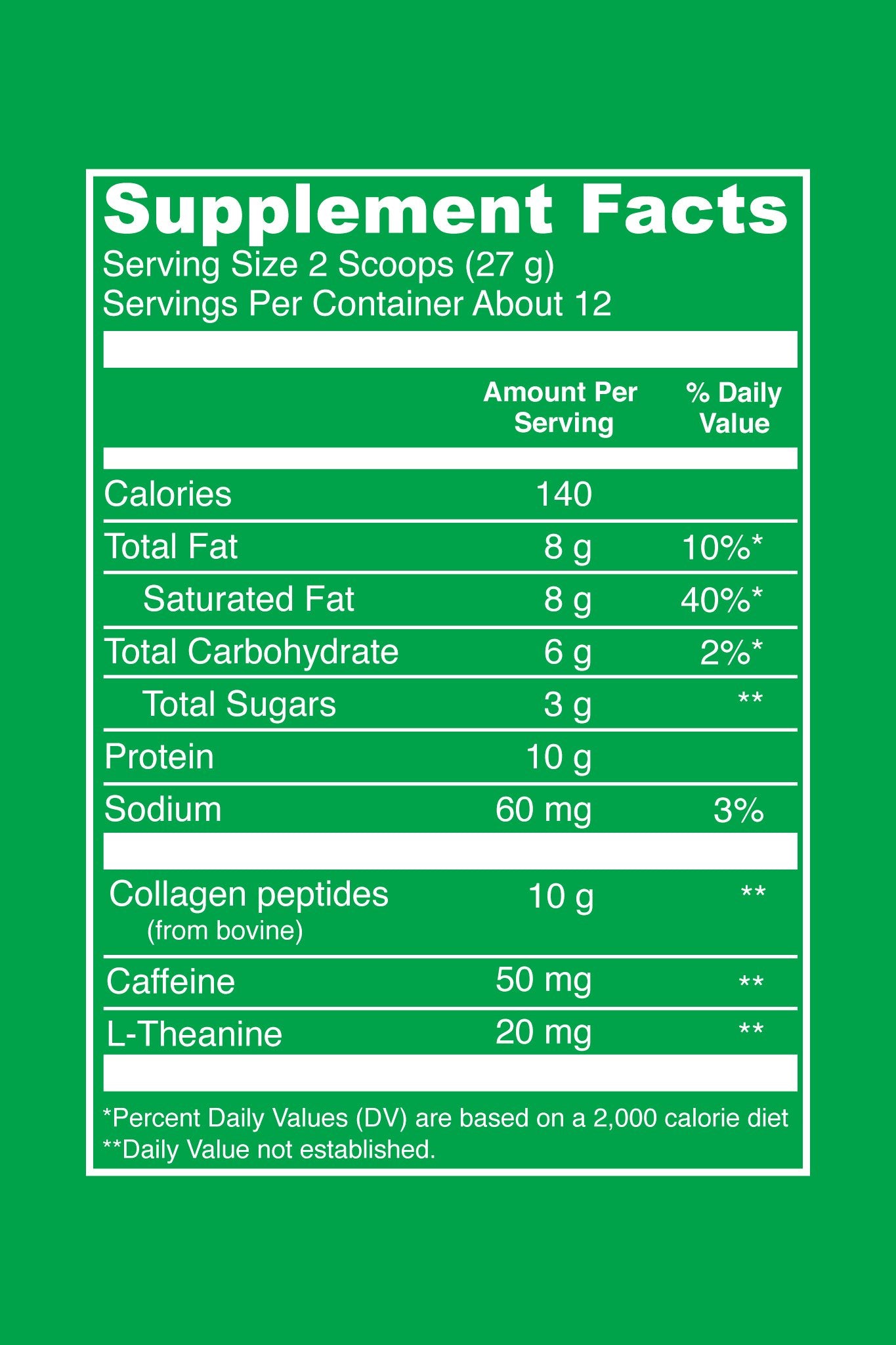 Enjoying a decadent beverage is only two scoops and a sip away thanks to our Matcha Latte, which pairs Matcha Collagen with coconut milk powder. Each cup offers 10g of collagen and a calm sense of alertness.** Start your morning off on the right sip!